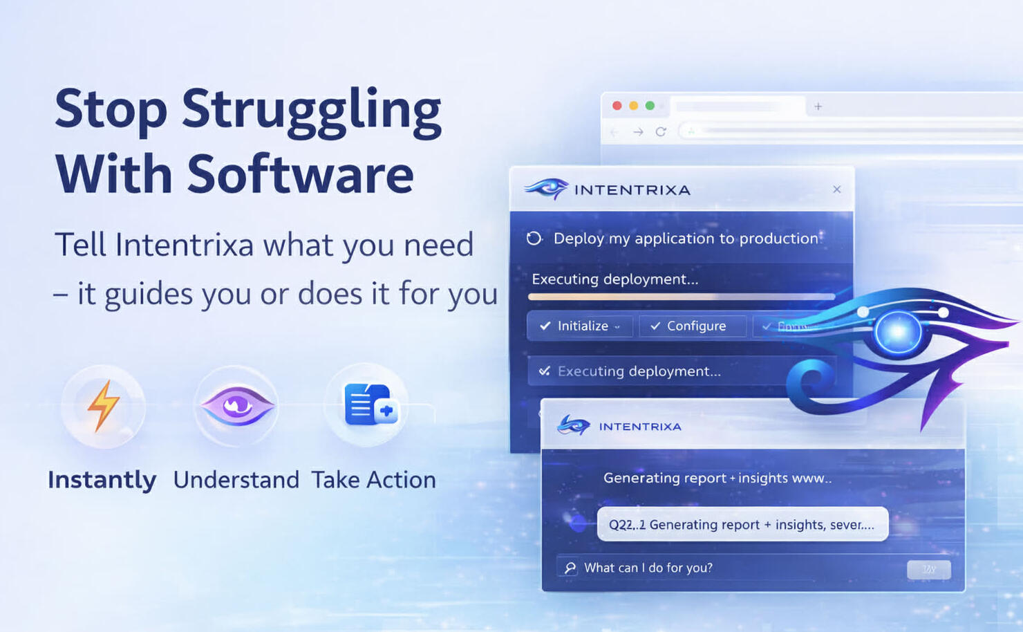 Operating independently of integrations or predefined workflows, Intentrixa adapts dynamically to unfamiliar software environments, evaluates confidence and risk, and delivers real-time guidance or controlled execution through an integration-agnostic cognition layer.
